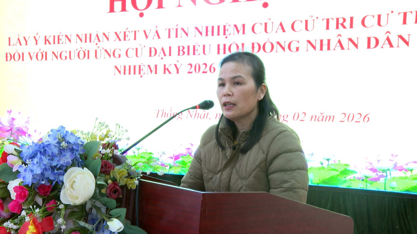 Tại hội nghị, sau khi đại diện Ban tổ chức thông qua tiểu sử tóm tắt của đồng chí được lấy ý kiến, cử tri thôn Thống Nhất đã tham gia nhận xét một cách dân chủ, thẳng thắn và trách nhiệm. Các ý kiến đều đánh giá các đồng chí ứng cử có phẩm chất chính trị vững vàng, đạo đức, lối sống lành mạnh, chấp hành tốt chủ trương của Đảng, chính sách, pháp luật của Nhà nước; có tinh thần trách nhiệm trong công tác, mối quan hệ gắn bó với Nhân dân nơi cư trú.