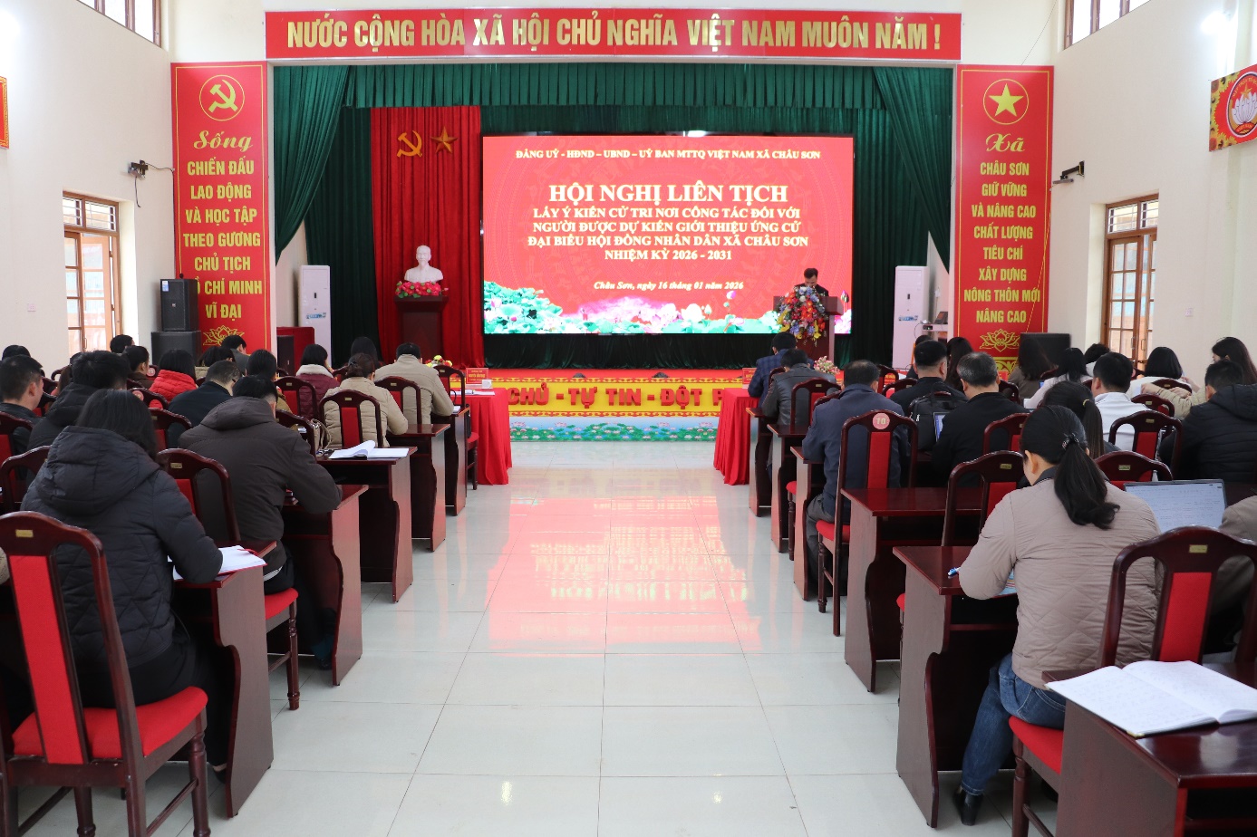 Thực hiện Luật Tổ chức chính quyền địa phương và các văn bản hướng dẫn về công tác bầu cử đại biểu Hội đồng nhân dân các cấp nhiệm kỳ 2026–2031. Ngày 16/01/2026, Đảng ủy – HĐND – UBND – Ủy ban MTTQ Việt Nam xã Châu Sơn đã tổ chức Hội nghị liên tịch lấy ý kiến của cử tri nơi công tác đối với người được dự kiến giới thiệu ứng cử đại biểu Hội đồng nhân dân xã nhiệm kỳ 2026–2031.