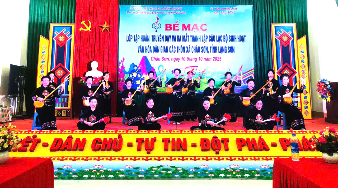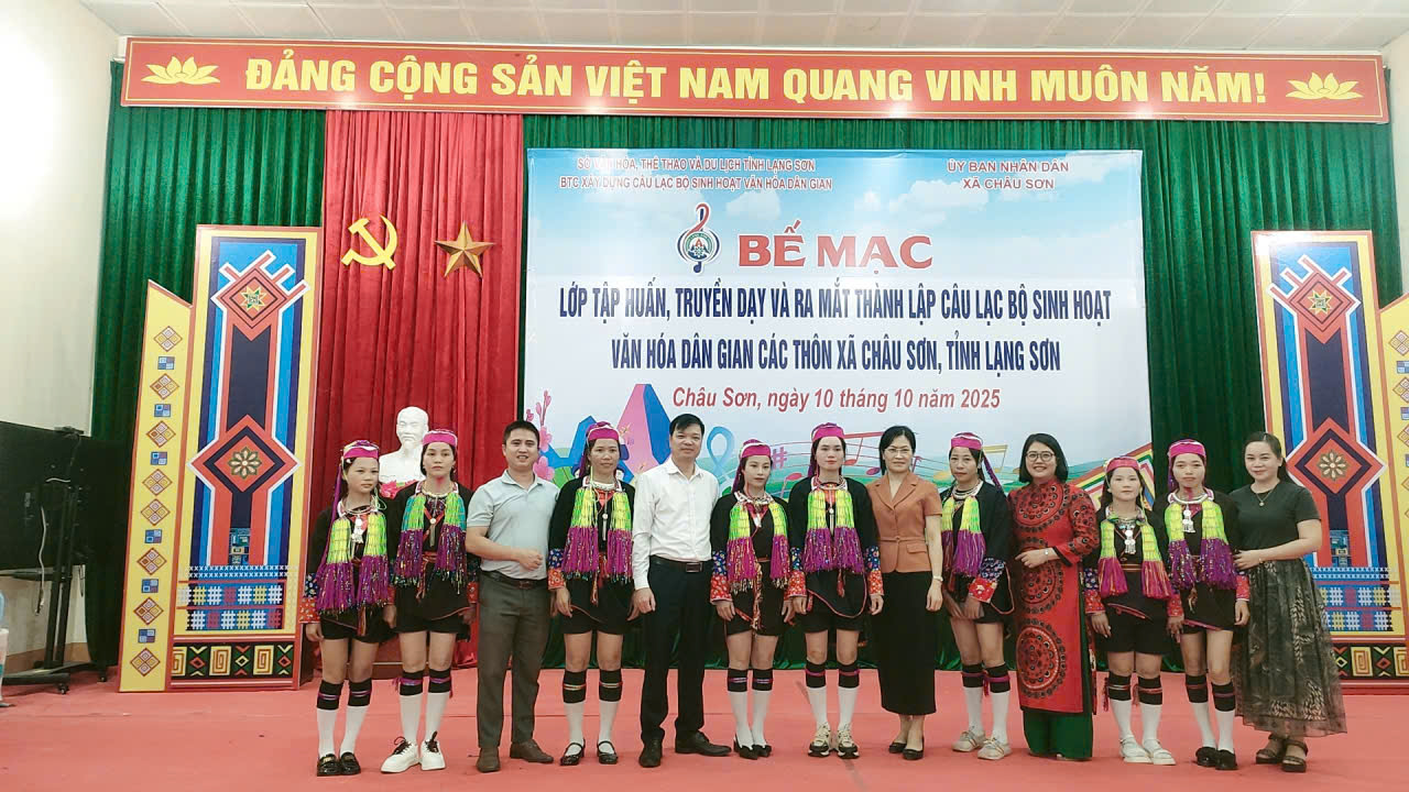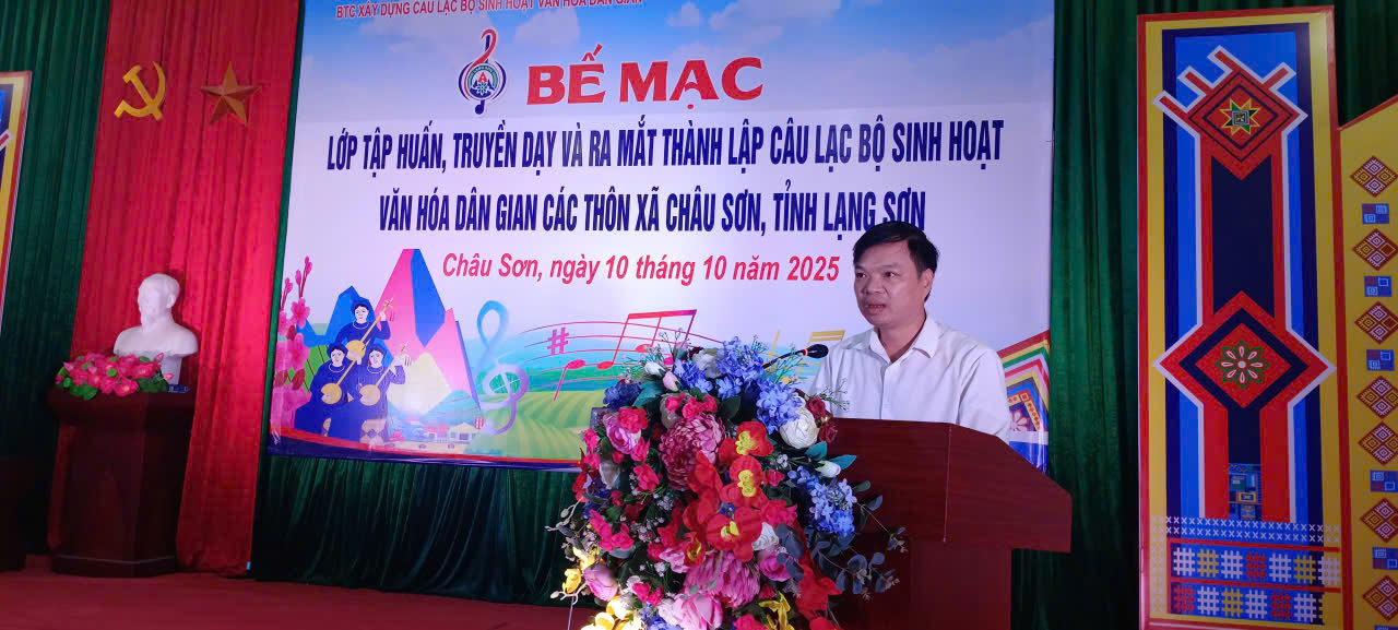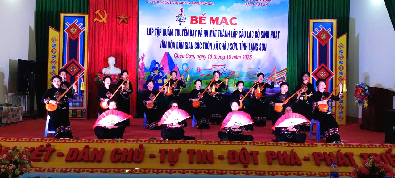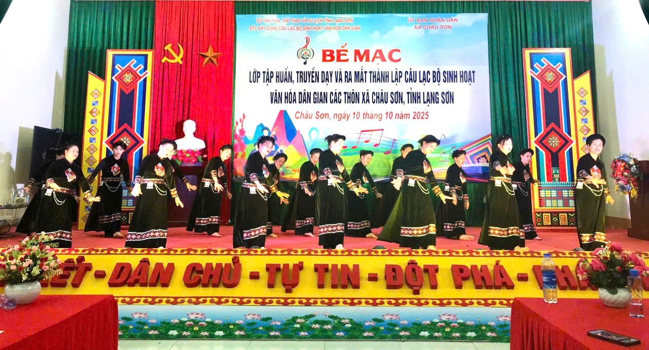 Tối ngày 10 tháng 10 năm 2025, tại Nhà văn hóa xã Châu Sơn, UBND xã Châu Sơn phối hợp với Sở Văn hóa, Thể thao và Du lịch tỉnh Lạng Sơn long trọng tổ chức Lễ bế mạc lớp tập huấn, truyền dạy và ra mắt Câu lạc bộ sinh hoạt văn hóa dân gian các thôn trên địa bàn xã.