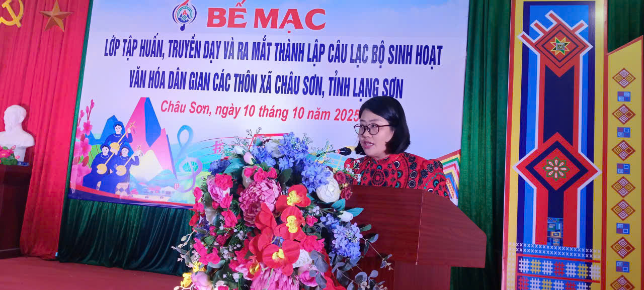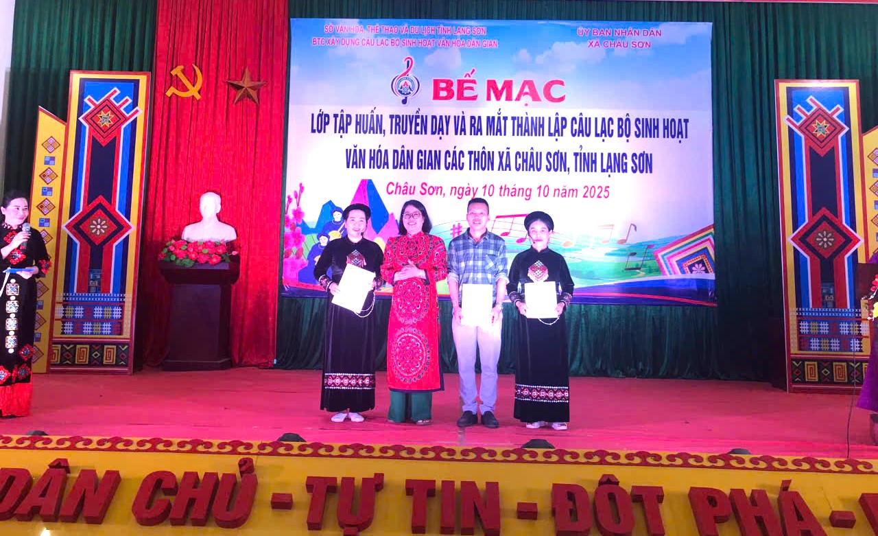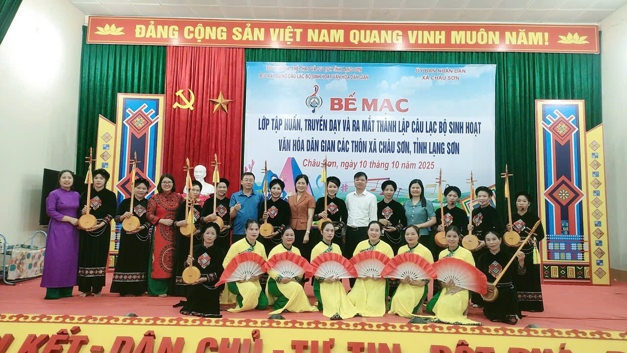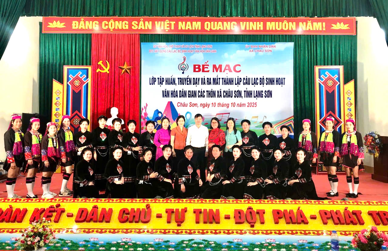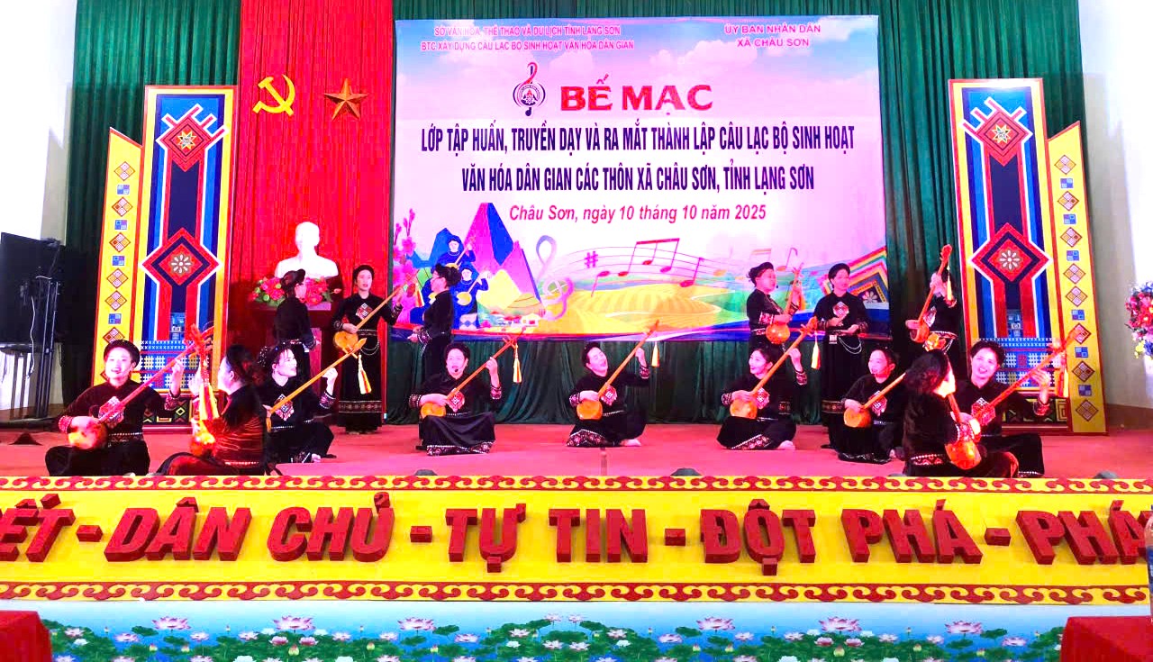 Tối ngày 10 tháng 10 năm 2025, tại Nhà văn hóa xã Châu Sơn, UBND xã Châu Sơn phối hợp với Sở Văn hóa, Thể thao và Du lịch tỉnh Lạng Sơn long trọng tổ chức Lễ bế mạc lớp tập huấn, truyền dạy và ra mắt Câu lạc bộ sinh hoạt văn hóa dân gian các thôn trên địa bàn xã.