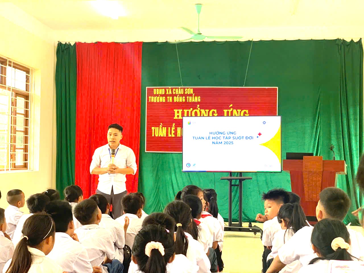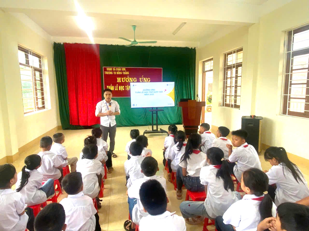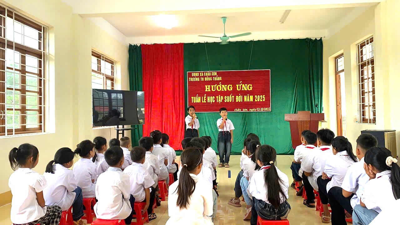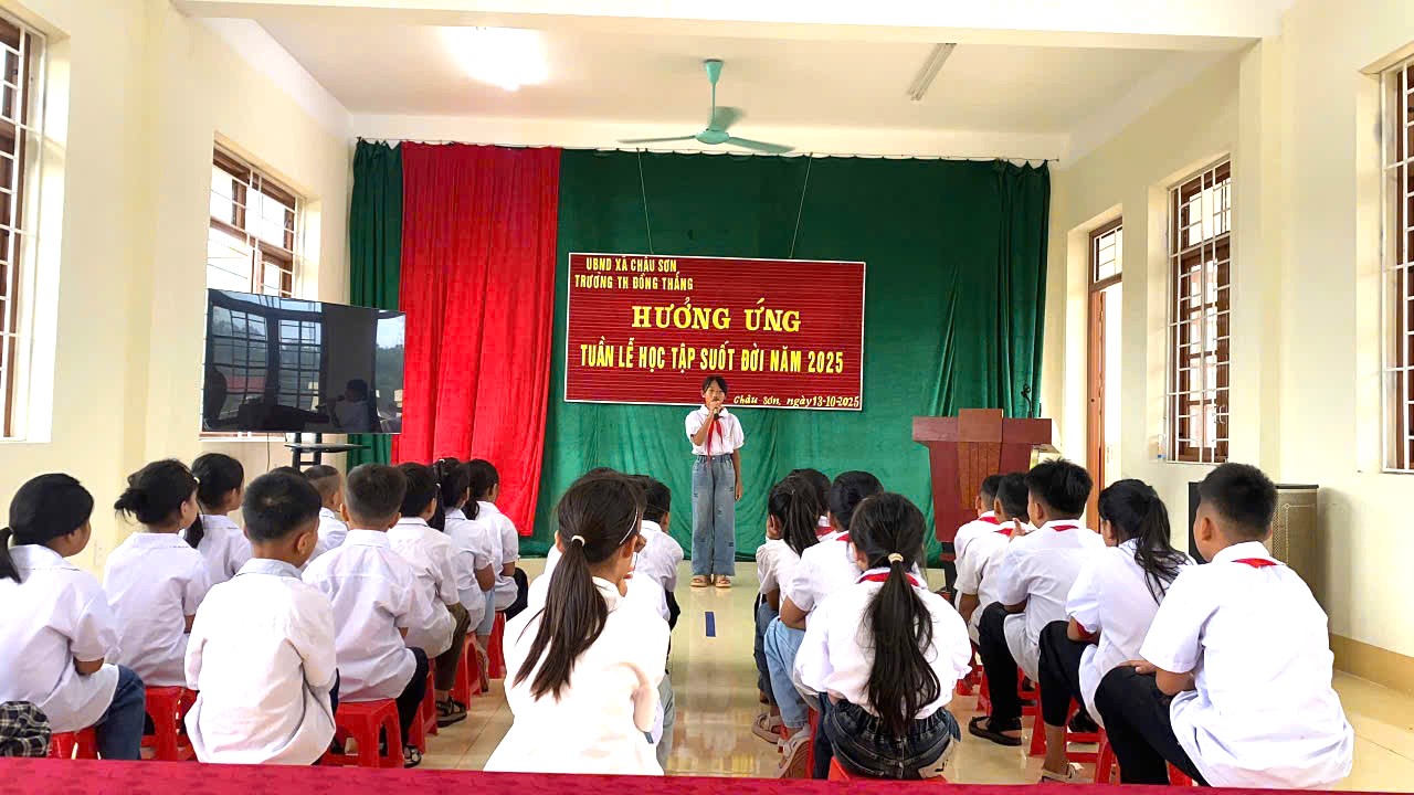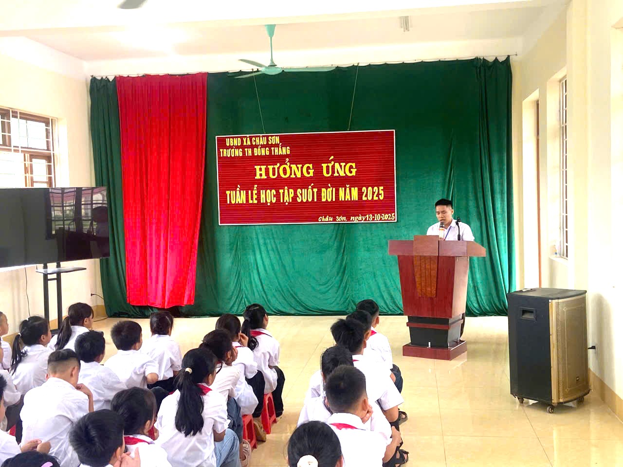 Thực hiện chỉ đạo của Ủy ban nhân dân xã Châu Sơn và Phòng Văn hoá – Xã hội về việc tổ chức các hoạt động hưởng ứng “Tuần lễ học tập suốt đời năm 2025” với chủ đề “Học tập suốt đời – Nền tảng cho tương lai bền vững”, sáng ngày 13 tháng 10 năm 2025, Trường Tiểu học Đồng Thắng đã tổ chức buổi sinh hoạt hưởng ứng với nhiều nội dung phong phú, thiết thực và ý nghĩa.