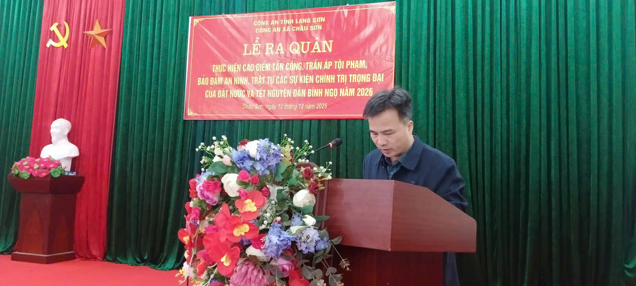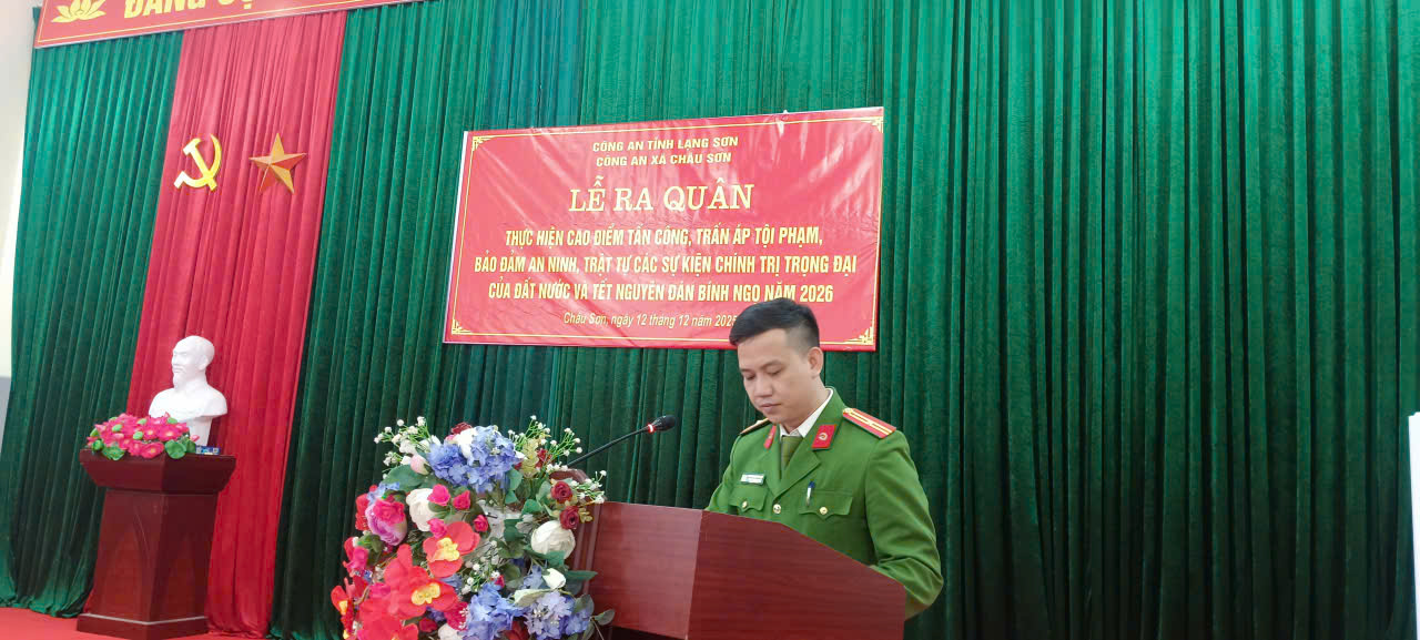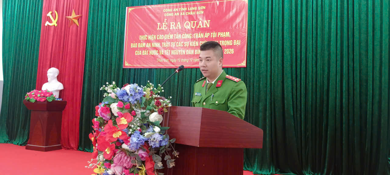 Sáng ngày 12/12/2025, Công an xã Châu Sơn tổ chức Lễ ra quân thực hiện cao điểm tấn công, trấn áp tội phạm, bảo đảm an ninh, trật tự các sự kiện chính trị quan trọng của đất nước và Tết Nguyên đán Bính Ngọ năm 2026. Buổi lễ diễn ra trang trọng với sự tham dự của các đồng chí Nguyễn Hữu Trực, Bí thư Đảng ủy, Chủ tịch HĐND xã; ông Nguyễn Công Hưng, Phó Bí thư Đảng uỷ, Chủ tịch UBND xã; cùng đại diện các ban ngành, đoàn thể đại diện cấp ủy, chính quyền địa phương cùng toàn thể cán bộ, chiến sĩ lực lượng công an xã.