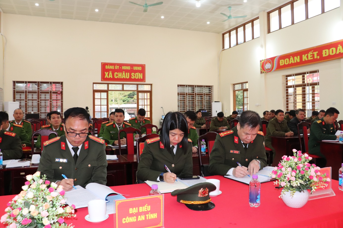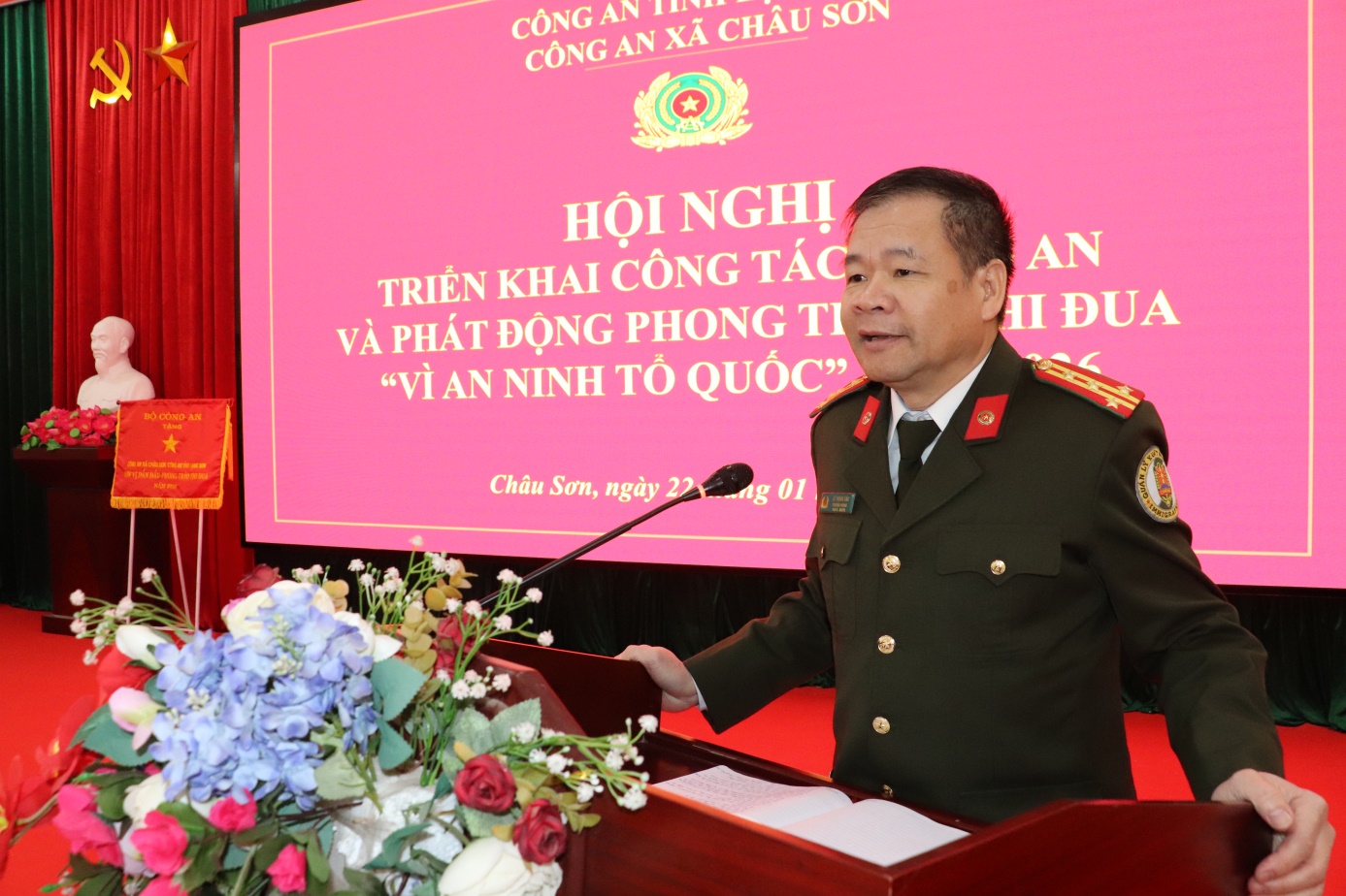Phát biểu tại hội nghị, Đồng chí Nguyễn Hữu Trực, Bí thư Đảng uỷ, Chủ tịch HĐND xã và đồng chí Đại tá Lê Trọng Sáu, Trưởng Phòng Xuất nhập cảnh PA08 ghi nhận, biểu dương và đánh giá cao tinh thần trách nhiệm, sự cố gắng của tập thể cán bộ, chiến sĩ Công an xã trong thời gian qua. Đồng thời các đồng chí cũng đề nghị trong năm 2026, Công an xã Châu Sơn cần tập trung thực hiện tốt một số nhiệm vụ trọng tâm như: Tiếp tục quán triệt sâu sắc chủ trương, nghị quyết của Đảng, chính sách pháp luật của Nhà nước; các chỉ đạo của Bộ Công an, Công an tỉnh và Đảng uỷ xã về công tác đảm bảo ANTT trong điều kiện thực hiện mô hình chính quyền địa phương 02 cấp. Chủ động tham mưu cho cấp uỷ, chính quyền xã trong lãnh đạo, chỉ đạo công tác đảm bảo an ninh chính trị, trật tự an toàn xã hội, đáp ứng yêu cầu nhiệm vụ trong giai đoạn mới. Chủ động nắm chắc tình hình từ sớm, từ xa, từ cơ sở, quản lý chặt chẽ địa bàn, đối tượng; kịp thời phát hiện, ngăn chặn, xử lý các vấn đề phức tạp phát sinh, không để bị động, bất ngờ; Tăng cường công tác quản lý lý nhà nước về ANTT; Tập trung cao độ cho nhiệm vụ bảo đảm an ninh, an toàn cuộc bầu cử Đại biểu Quốc hội khóa XVI và đại biểu HĐND các cấp nhiệm kỳ 2026 -2031. Tiếp tục đẩy mạnh phong trào “Toàn dân bảo vệ an ninh Tổ quốc, phát huy sức mạnh tổng hợp của Nhân dân trong giữ gìn an ninh trật tự ở cơ sở; Chú trọng xây dựng lực lượng Công an xã thật sự trong sạch, vững mạnh, chính quy, tinh nhuệ; Tiếp tục đẩy mạnh ứng dụng công nghệ thông tin, chuyển đổi số trong công tác công an xã; triển khai hiệu quả Đề án 06 của Chính phủ, gần với cải cách thủ tục hành chính, góp phần nâng cao hiệu lực, hiệu quả quản lý nhà nước và phục vụ Nhân dân ngày càng tốt hơn….Đề nghị UBND xã, các cơ quan, đoàn thể tiếp tục quan tâm phối hợp, tạo điều kiện thuận lợi để Công an xã hoàn thành tốt nhiệm vụ. Đồng thời, mong muốn toàn thể cán bộ, chiến sĩ Công an xã tiếp tục nỗ lực phần đầu, đáp ứng yêu cầu nhiệm vụ trong tỉnh hình mới.
