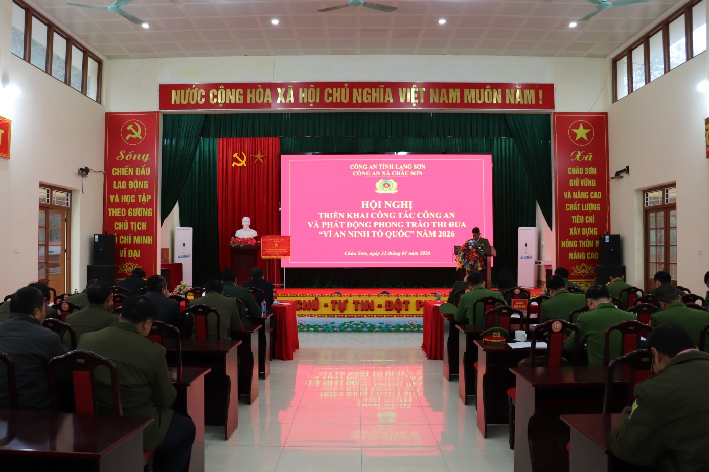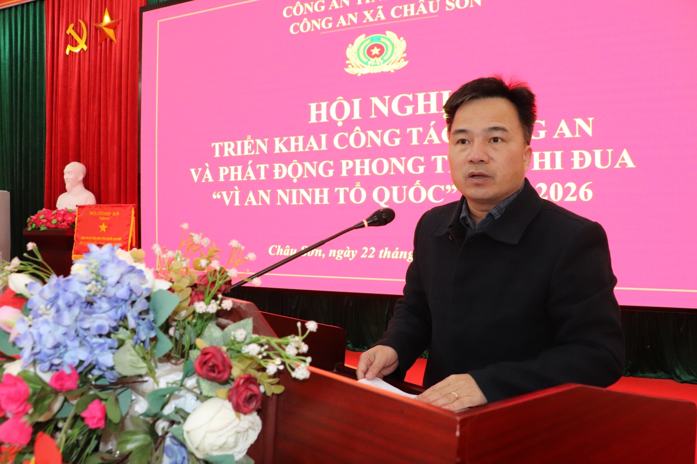Ngày 22/01/2026, Công an xã Châu Sơn tổ chức hội nghị triển khai công tác Công an và phát động phong trào thi đua “Vì an ninh Tổ quốc” năm 2026. Dự và chỉ đạo hội nghị về phía xã có đồng chí Nguyễn Hữu Trực, Bí thư Đảng uỷ - Chủ tịch HĐND xã; về phía Công an tỉnh có đồng chí Đại tá Lê Trọng Sáu- Trưởng Phòng Xuất nhập cảnh PA08; và các đồng chí lãnh đạo HĐND – UBND – UBMTTQ xã Châu Sơn.