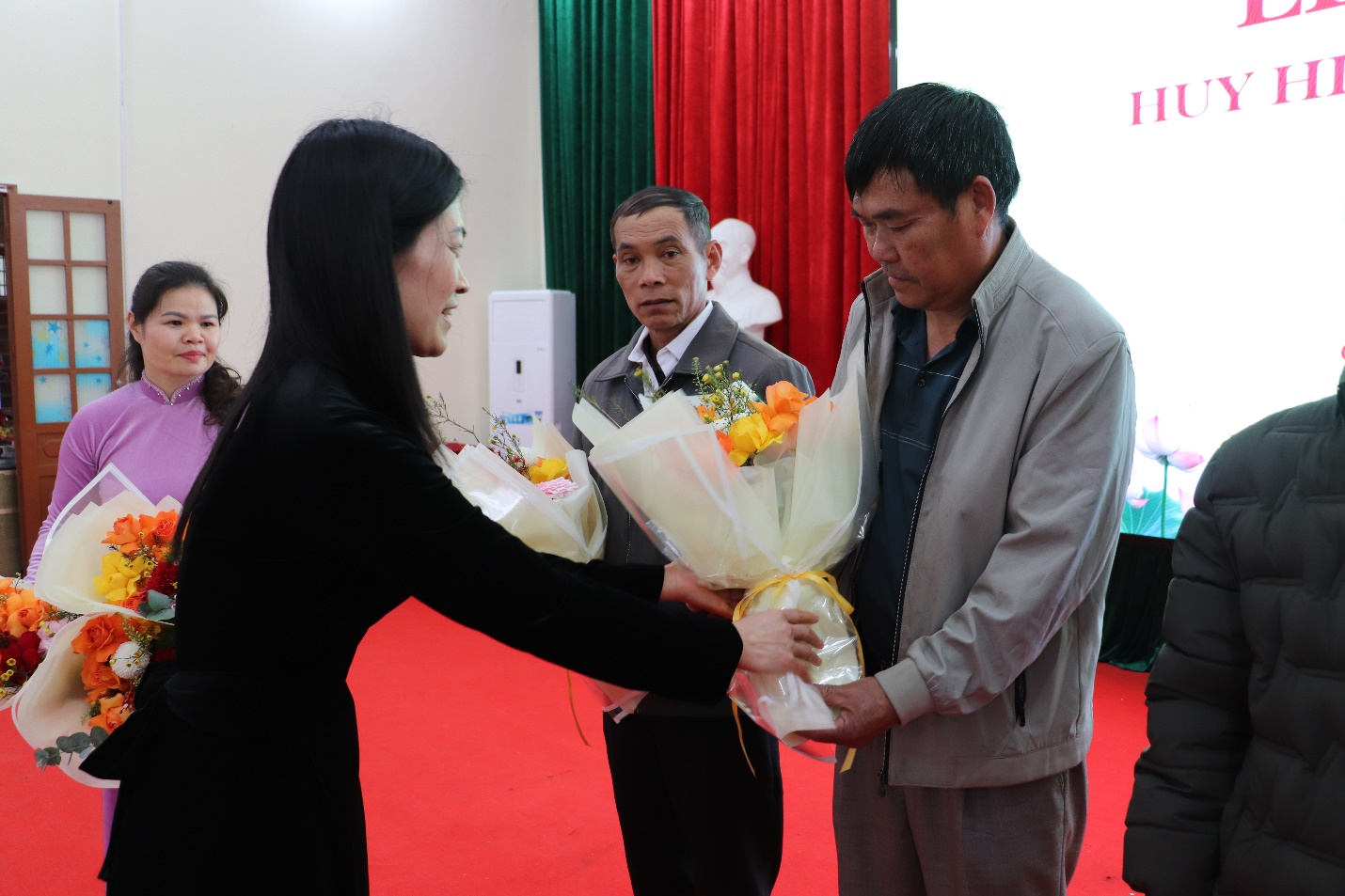 Lãnh đạo Đảng ủy xã trao huy hiệu và tặng hoa chúc mừng các đồng chí