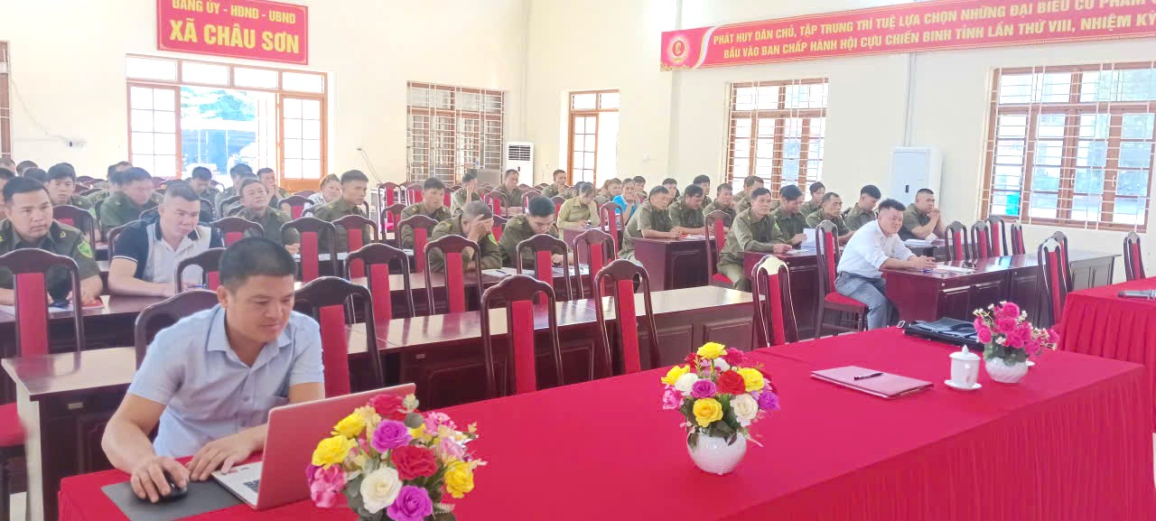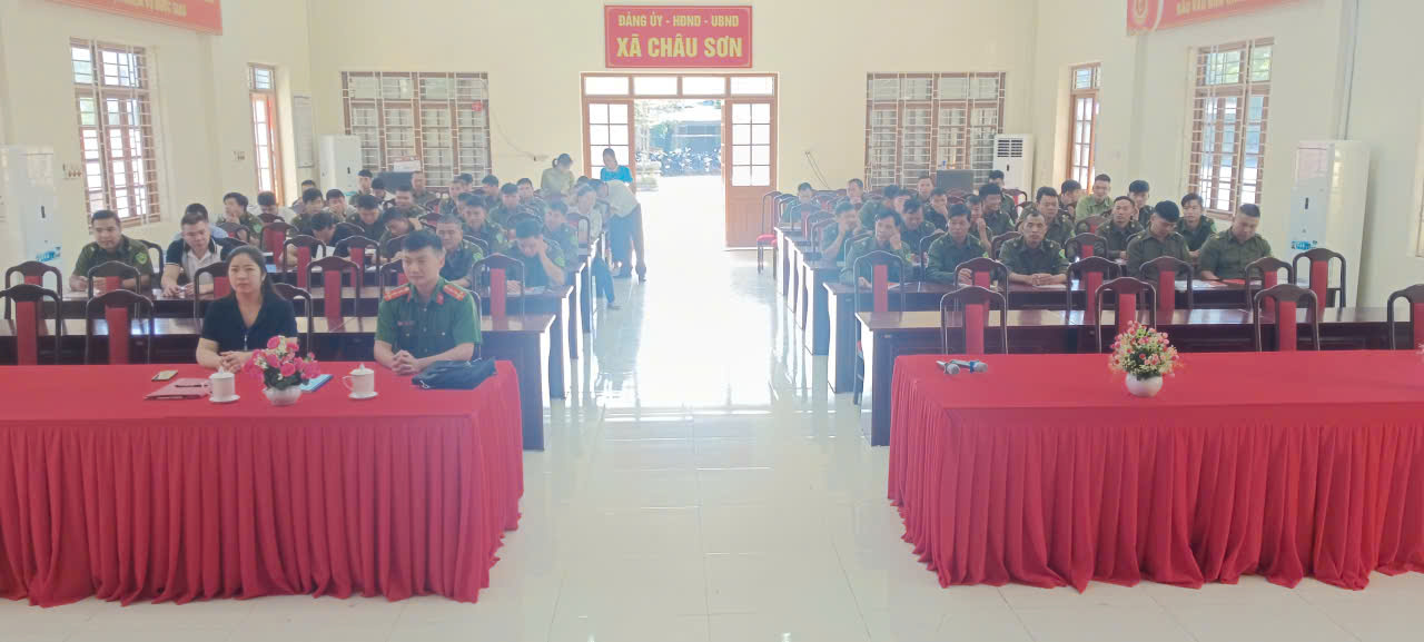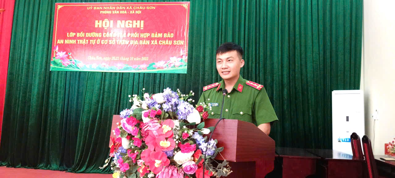 Trong 2 ngày 20–21/10/2025, tại Hội trường Ủy ban nhân dân xã Châu Sơn, Phòng Văn hóa – Xã hội xã Châu Sơn phối hợp với Công an xã tổ chức Hội nghị bồi dưỡng công tác phối hợp đảm bảo an ninh trật tự ở cơ sở cho lực lượng công an viên, dân quân tự vệ và các tổ chức đoàn thể trên địa bàn (72 người). Chủ trì tổ chức hội nghị có đồng chí Lý Thị Huệ, uỷ viên Ban Chấp hành Đảng uỷ, Trưởng phòng Văn hoá – Xã hội; đồng chí Đại uý Chu Quốc Hưng, Phó trưởng Công an xã Châu Sơn.