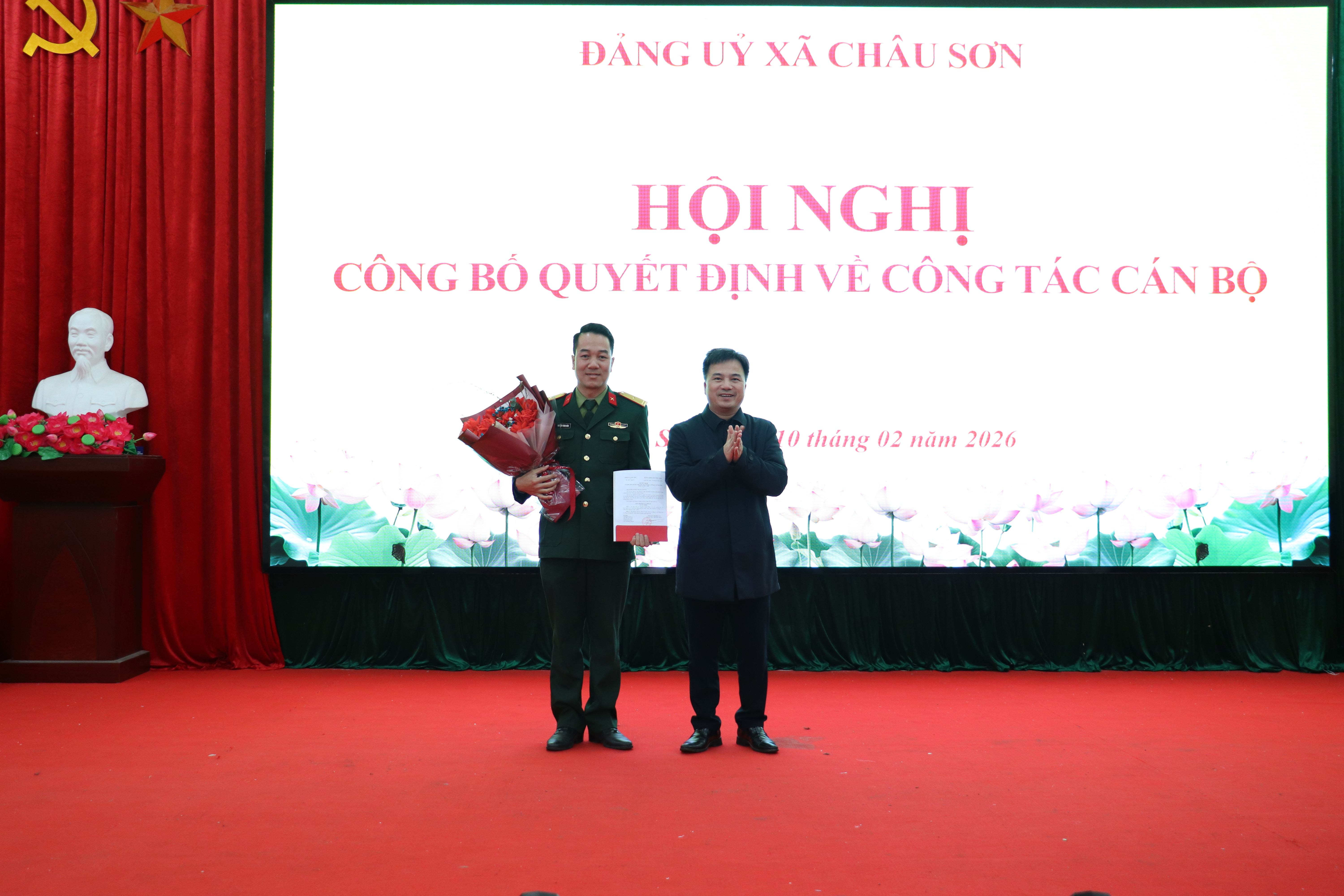 Ngày 10/02/2026, Ban Thường vụ Đảng uỷ xã Châu Sơn tổ chức hội nghị công bố quyết định về công tác cán bộ năm 2026. Dự và chỉ đạo hội nghị có đồng chí Nguyễn Hữu Trực, Bí thư Đảng uỷ, Chủ tịch HĐND xã; đồng chí Vi Thị Thu, Phó Bí thư Thường trực Đảng uỷ; đồng chí Nguyễn Công Hưng, Phó Bí thư Đảng uỷ, Chủ tịch UBND xã; cùng các đồng chí lãnh đạo Đảng uỷ - HĐND – UBND – UBMTTQVN xã.