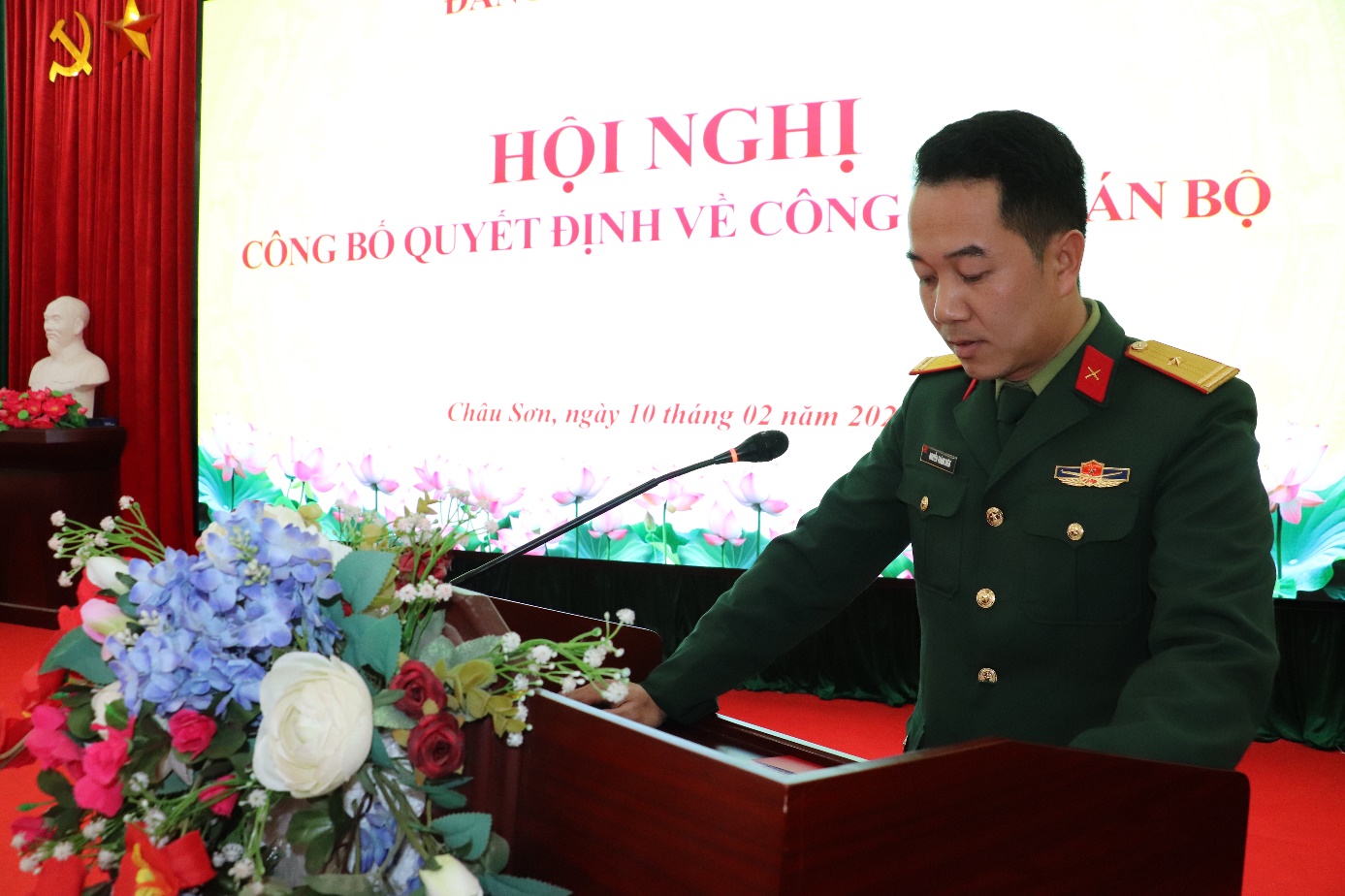 Tại hội nghị, đại diện Ban xây dựng Đảng uỷ đã công bố Quyết định số 262-QĐ/TU ngày 31/01/2026 của Ban Thường vụ Tỉnh ủy về việc chỉ định tham gia Ban chấp hành, Ban thường vụ Đảng uỷ xã Châu Sơn nhiệm kỳ 2025-2030 đối với đồng chí Nguyễn Thành Biên, Chỉ huy trưởng Ban Chỉ huy Quân sự xã Châu Sơn tham gia Ban Chấp hành, Ban Thường vụ Đảng uỷ xã Châu Sơn nhiệm kỳ 2025 – 2030.