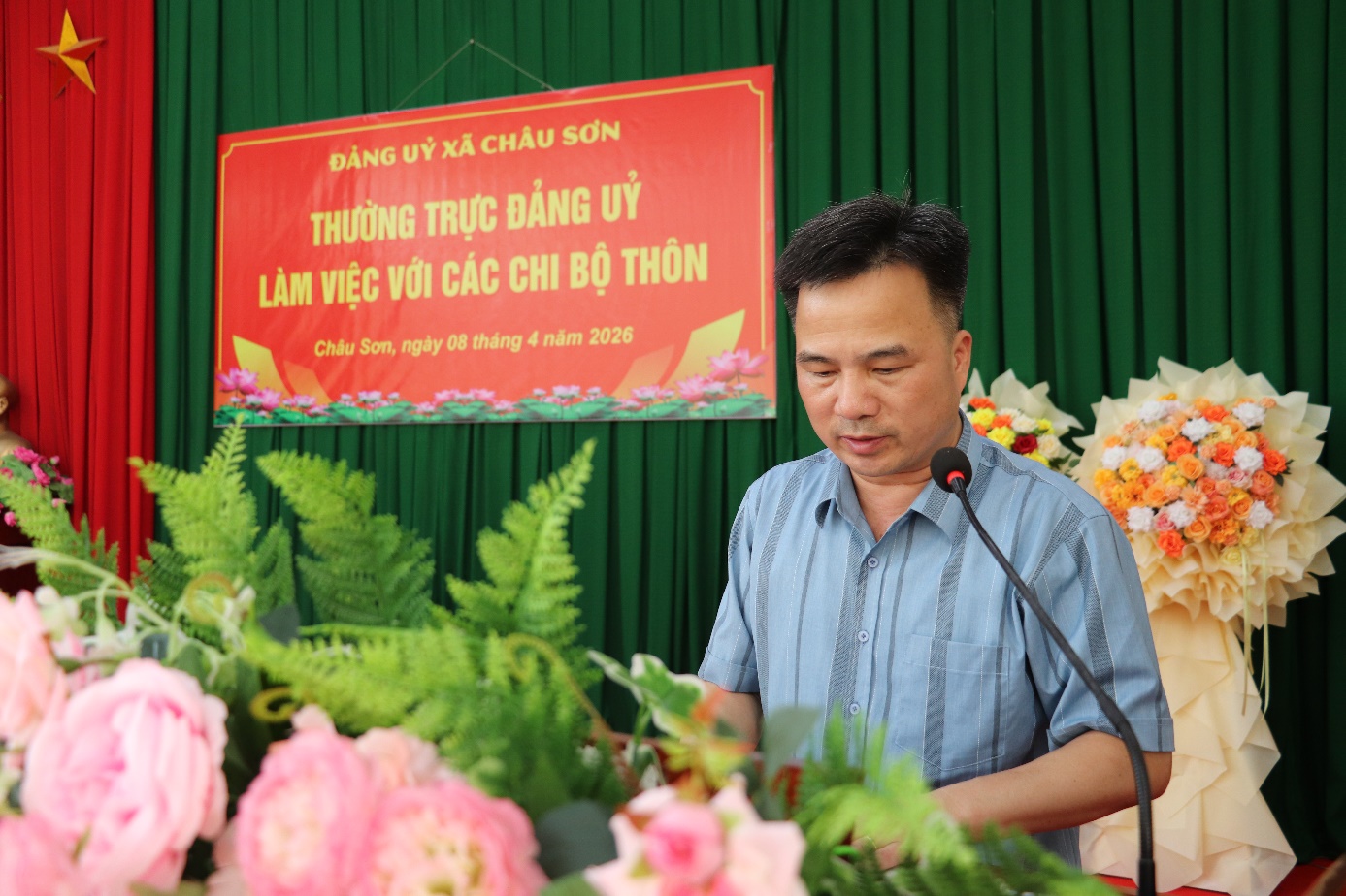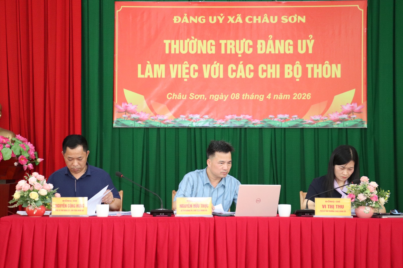 Ngày 8/4/2026, Tại hội trường Đảng ủy xã Châu Sơn, Thường trực Đảng ủy đã có buổi làm việc với 24 Chi bộ thôn trên địa bàn xã về công tác lãnh đạo, chỉ đạo, quản lý, điều hành và tổ chức triển khai thực hiện nhiệm vụ năm 2026. Đồng chí Nguyễn Hữu Trực, Bí thư Đảng uỷ - Chủ tịch HĐND xã; đồng chí Vi Thị Thu, Phó Bí thư Thường trực Đảng uỷ; đồng chí Nguyễn Công Hưng, Phó Bí thư Đảng uỷ- Chủ tịch UBND xã đồng chủ trì hội nghị.