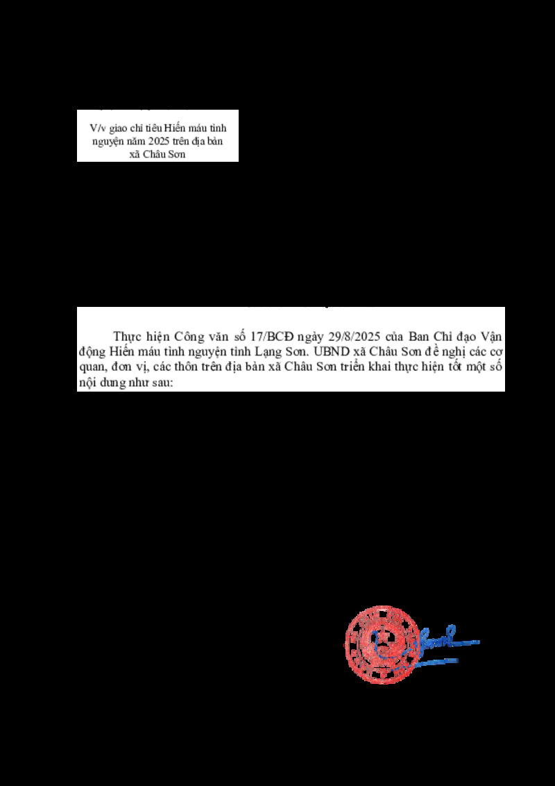 Tiêu đề văn bản Công văn V/v giao chỉ tiêu Hiến máu tình nguyện năm 2025 trên địa bàn xã Châu Sơn